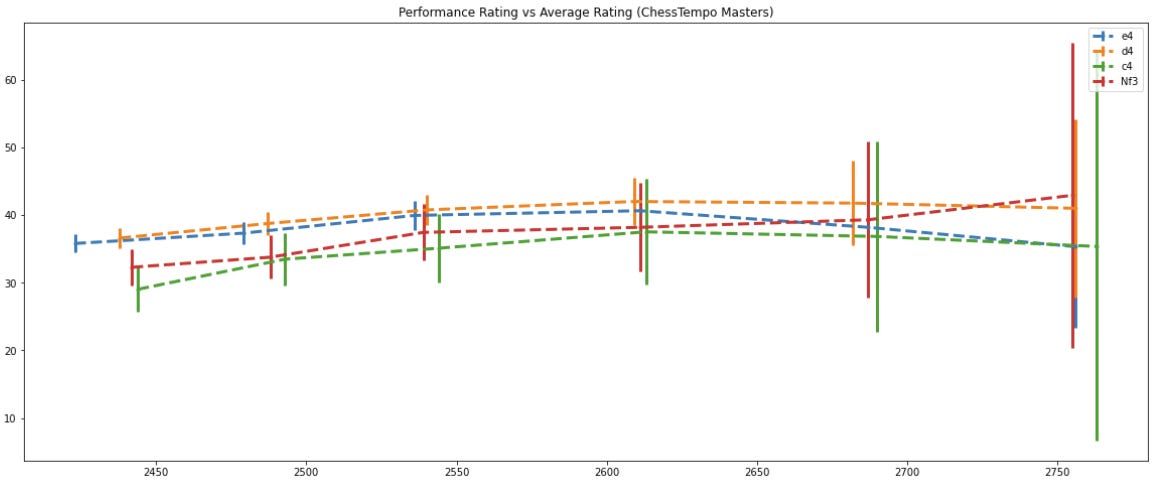 When we adjust for this, we still find that d4/c4/Nf3 outperform e4, but the difference isn’t so stark:
